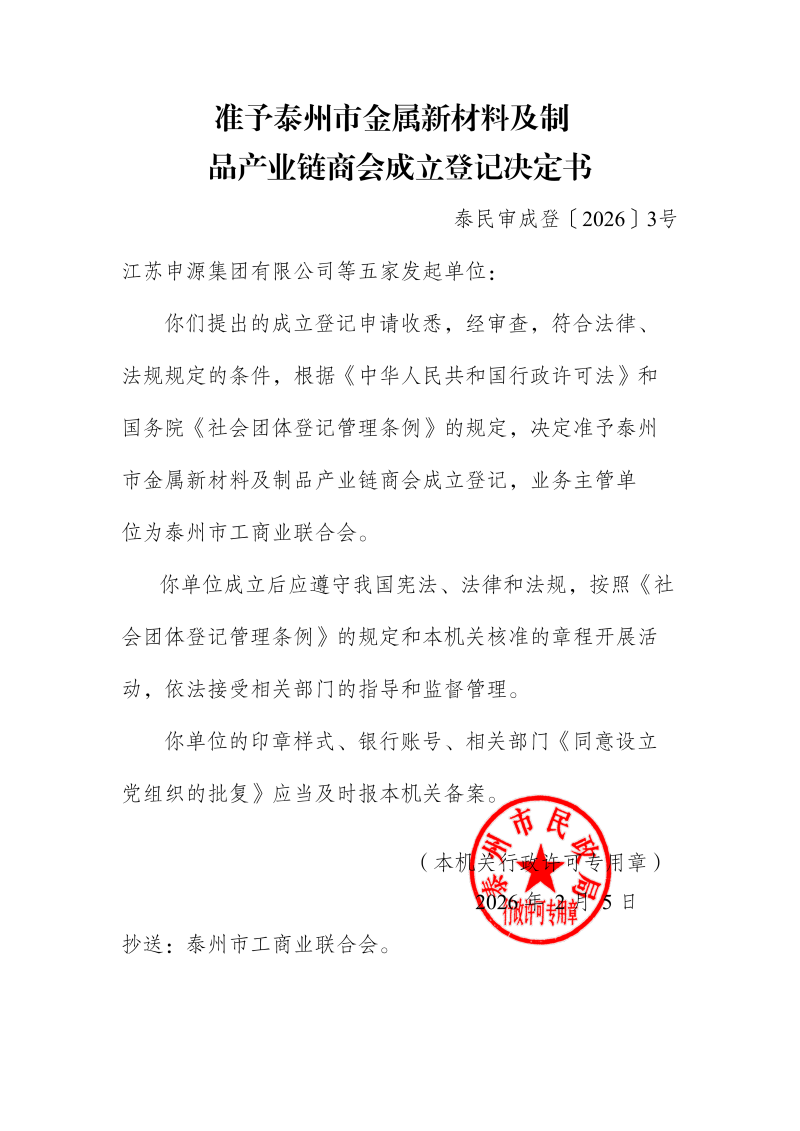 准予泰州市金属新材料及制品产业链商会成立登记决定书