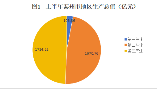 上半年泰州市实现地区生产总值3498.64亿元,按不变价格计算,同比增长5.7%。其中,第一产业增加值103.66亿元,同比增长4.8%;第二产业增加值1670.76亿元,增长3.5%;第三产业增加值1724.22亿元,增长8.1%。