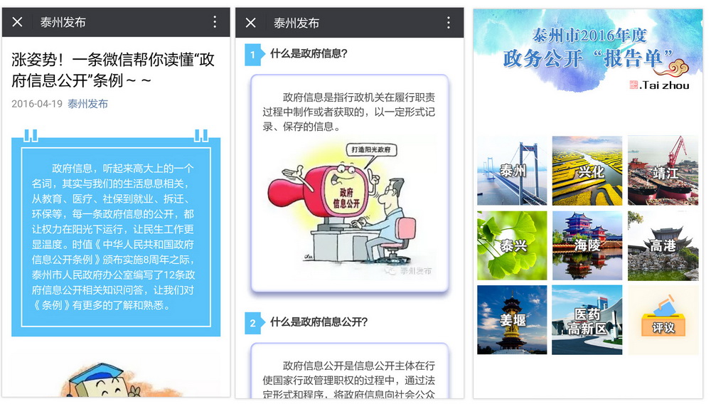 2.公开形式通俗化。围绕市委市政府中心工作,以制作门户网站政务专题形式,图文并茂全方位展现政府当前工作和重大活动,先后制作发布泰州两会、工业经济升级转型、建市20周年、深化改革等专题38个。改版政府信息公开专栏,突出图表、图形、数字等方式的展现,使主动公开的信息更加可视、可读、可感,增强吸引力和亲和力。制作政务公开政务服务宣传片,采用动漫形式将工作内容和平台功能向社会公众全景展现。在全市档案馆、图书馆及部分社区开设197个政府信息公开查阅点,推进信息公开查阅场所规范化服务,拓展公众覆盖面,依托全市各图书馆开展《“政”在你身边—民生热点300问》赠阅活动,最大程度方便群众获取政府政策。姜堰区编印《2016年涉农价、费公示表》,发放到辖区内的17个乡镇262个行政村常年公示,提高涉农收费和价格的透明度,维护农民的合法权益。