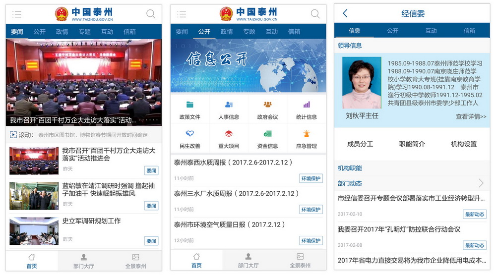 2.打造集约化程度高的“中国·泰州”微门户平台。整合全市82家政府职能部门网站,建成“中国·泰州”政府门户网站群,实现全市各部门网站信息和服务资源的充分共享。依托政府门户网站群,建成“中国•泰州”微门户,汇集要闻、公开、政情、专题、部门、信箱等频道,实现政府门户网站移动化,满足群众在智能终端上查阅政府信息、获取服务资讯、参与互动交流等需求。推进统一规范的部门微门户平台建设,整合部门相关资源,全维度公开部门信息。