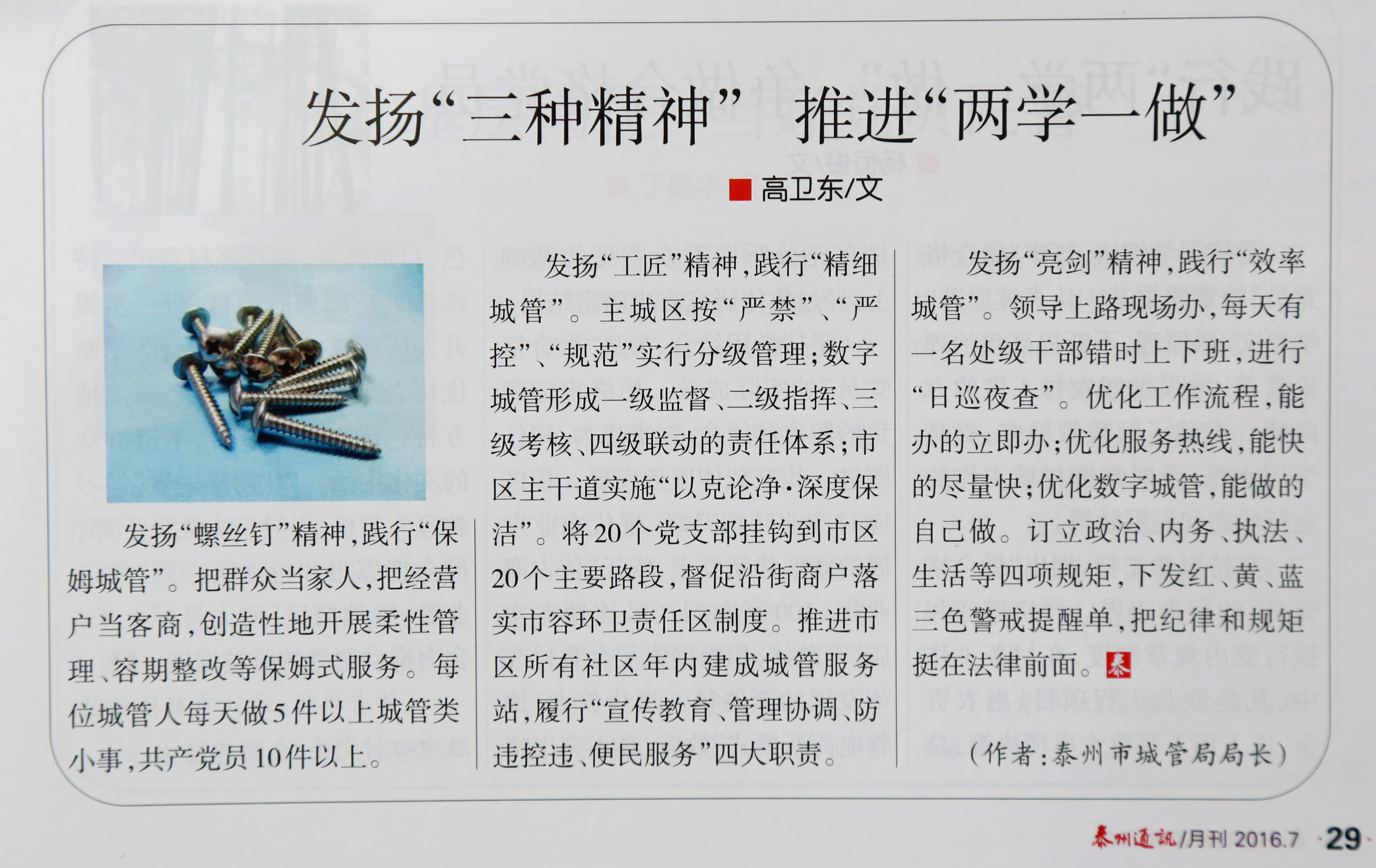 及时更新局门户网站、“泰州微城管”微信公众号,编发各类信息300多条,积极向“两办”报送信息116篇,被泰州快报、泰州通讯、泰州党建及政府门户网站采用53篇;强化“声屏网报”媒体宣传,联系泰州日报、泰州晚报、电视台、广播电台宣传城管工作96篇次,有力推动了“四个专项整治”、城管社区服务站、落实市容环卫责任区制度专项行动等工作开展;泰州城管之歌、保姆城管幸福家园行动被住建部“大城管”转载。