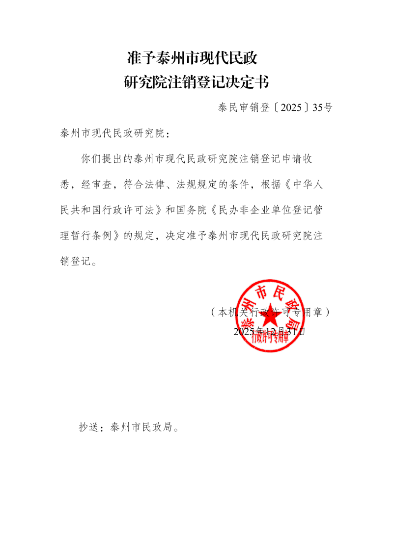 准予泰州市现代民政研究院注销登记决定书