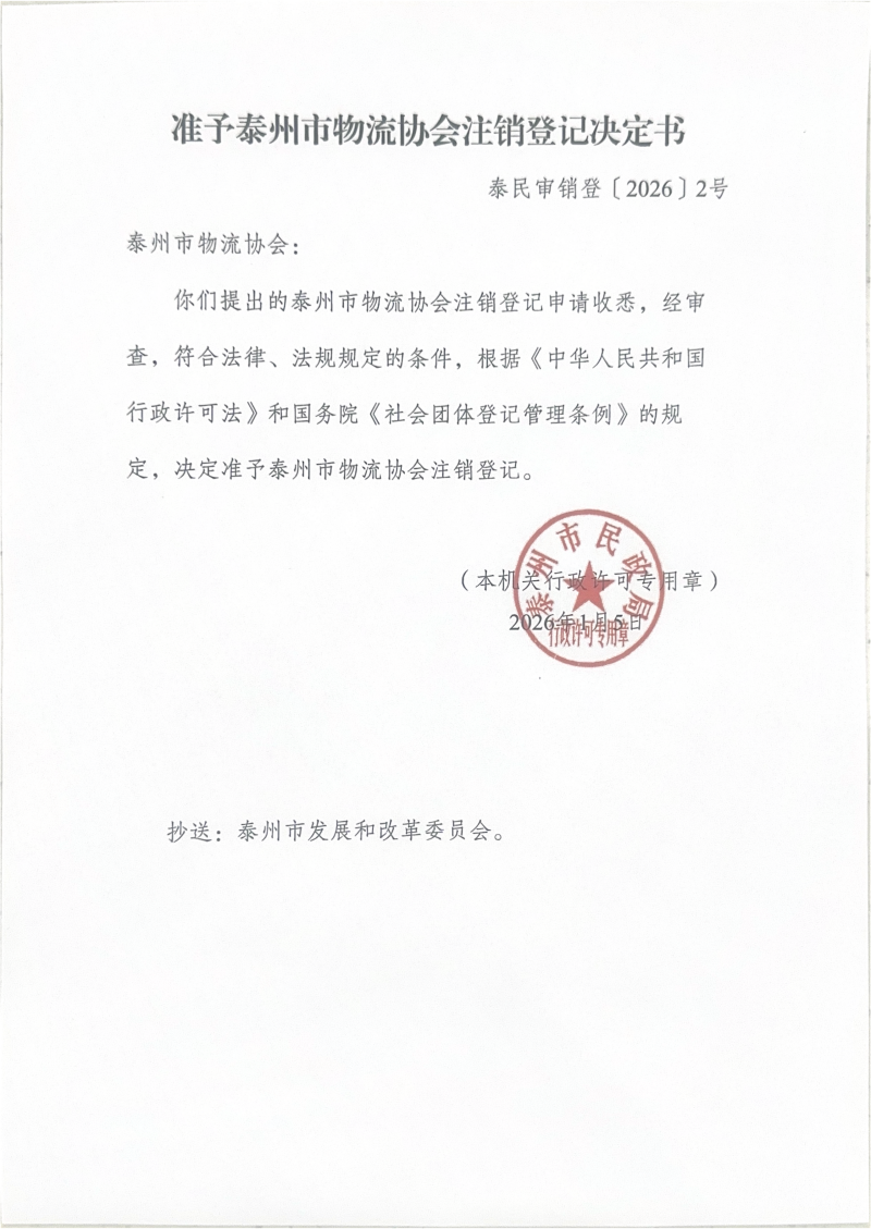 准予泰州市物流协会注销登记决定书